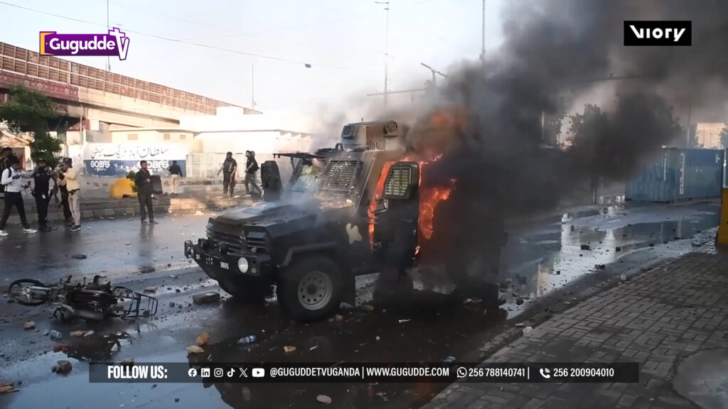 Riots erupted in Karachi on Sunday, where a police armoured vehicle was set ablaze during violent demonstrations near the US