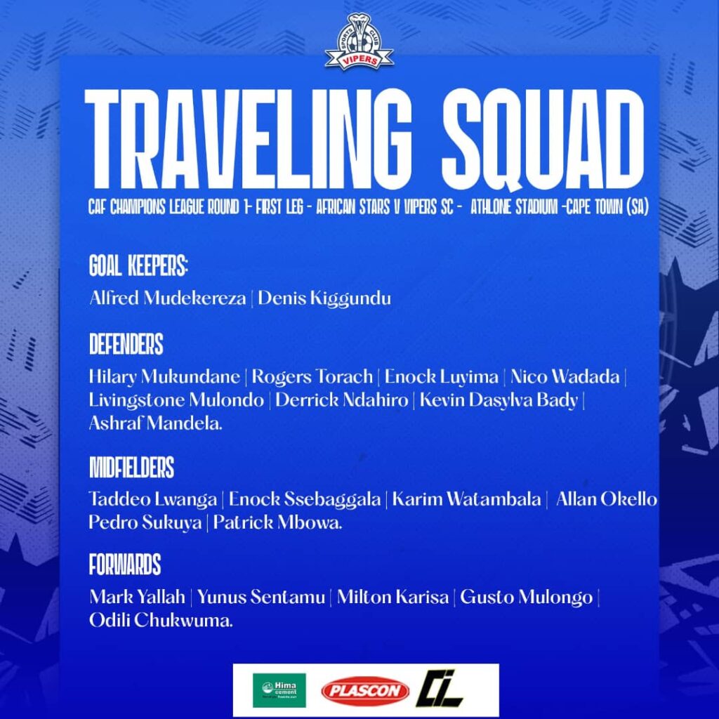 Uganda Premier League kings Vipers SC have unveiled a 20-man squad brimming with firepower and fresh faces ahead of their CAF Champions League preliminary round first leg showdown against Namibia’s African Stars in Cape Town this Friday.