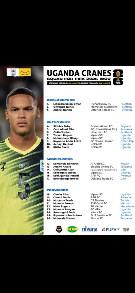 The US-based duo, Byaruhanga (Oakland Roots) and Oyirwoth (New England Revolution), return after missing out on the recent fixtures against Mozambique and Somalia. Their comeback is expected to inject creativity, composure, and attacking balance into a midfield that will be key to Uganda’s chances of securing positive results away from home.